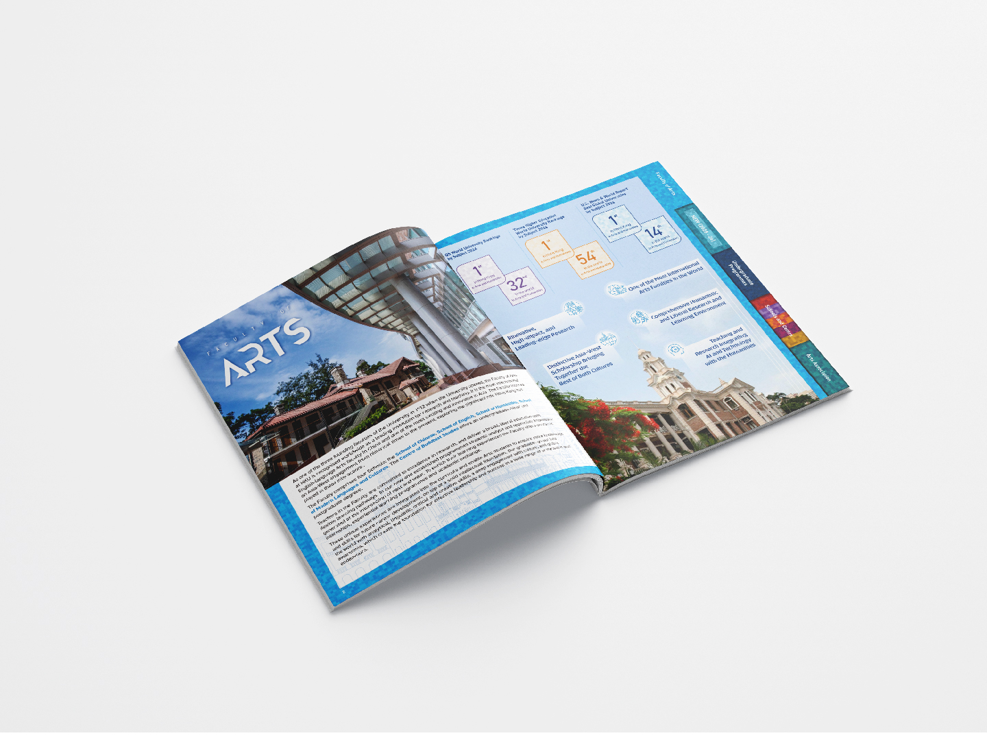 The cover and interior pages incorporate a pixel-based design, reflecting the faculty’s emphasis on research and innovation. Each section is colour-coded for clarity, making it easier to navigate programme details. A custom printing solution includes physical tabs for direct access to key sections, and spot UV coating on the front cover logo enhances visual impact. The final design ensures a structured and accessible presentation of the faculty’s programmes.