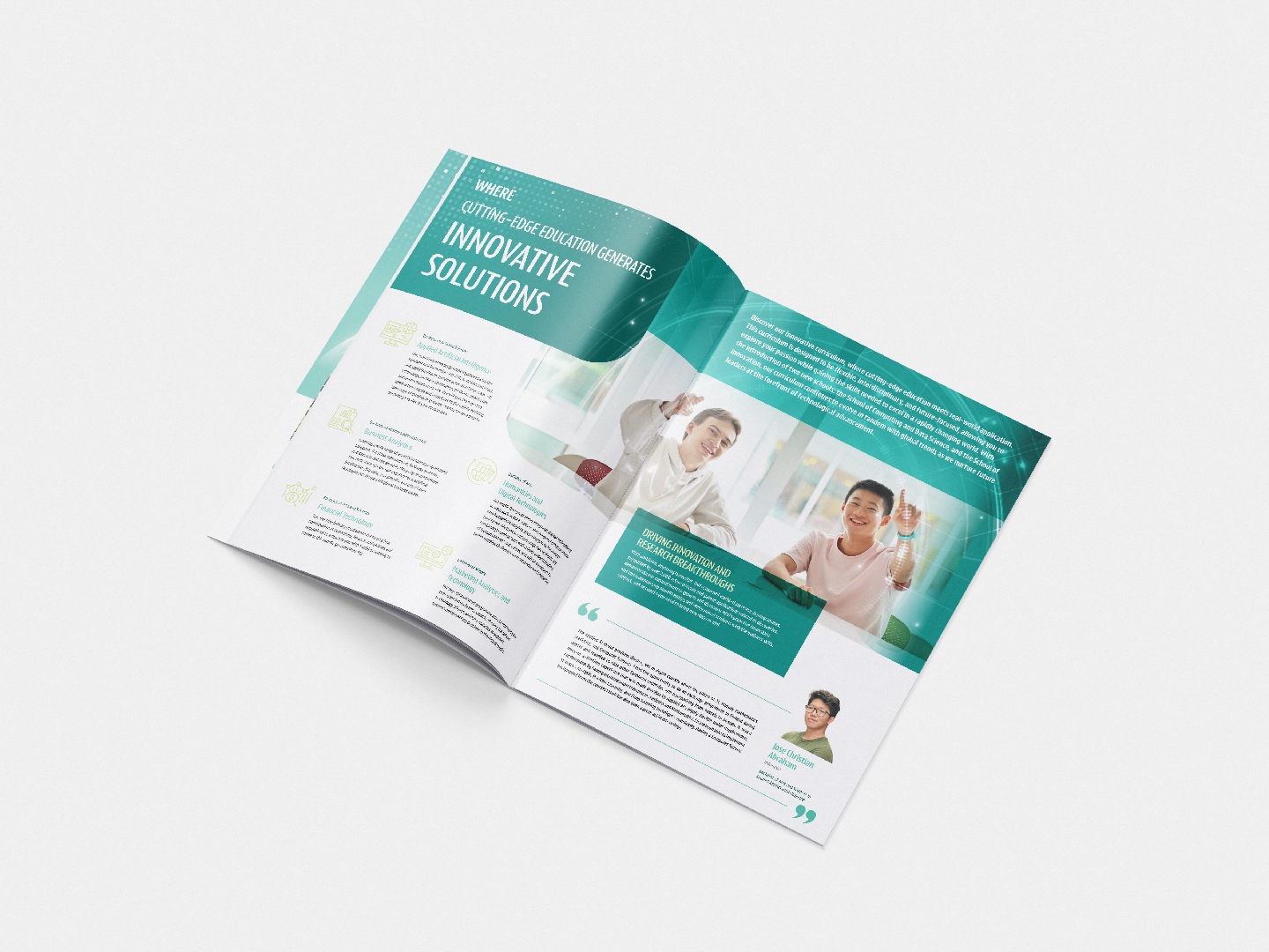 The cover and inner layouts of the booklet are designed to reflect the university’s recent research in A.I as well as their commitment to sustainability. A natural colour palette and custom technological graphics are used as overlays to integrate the two worlds. We also created infographics and complex table systems to make the details as accessible as possible to students looking for detailed admission information.