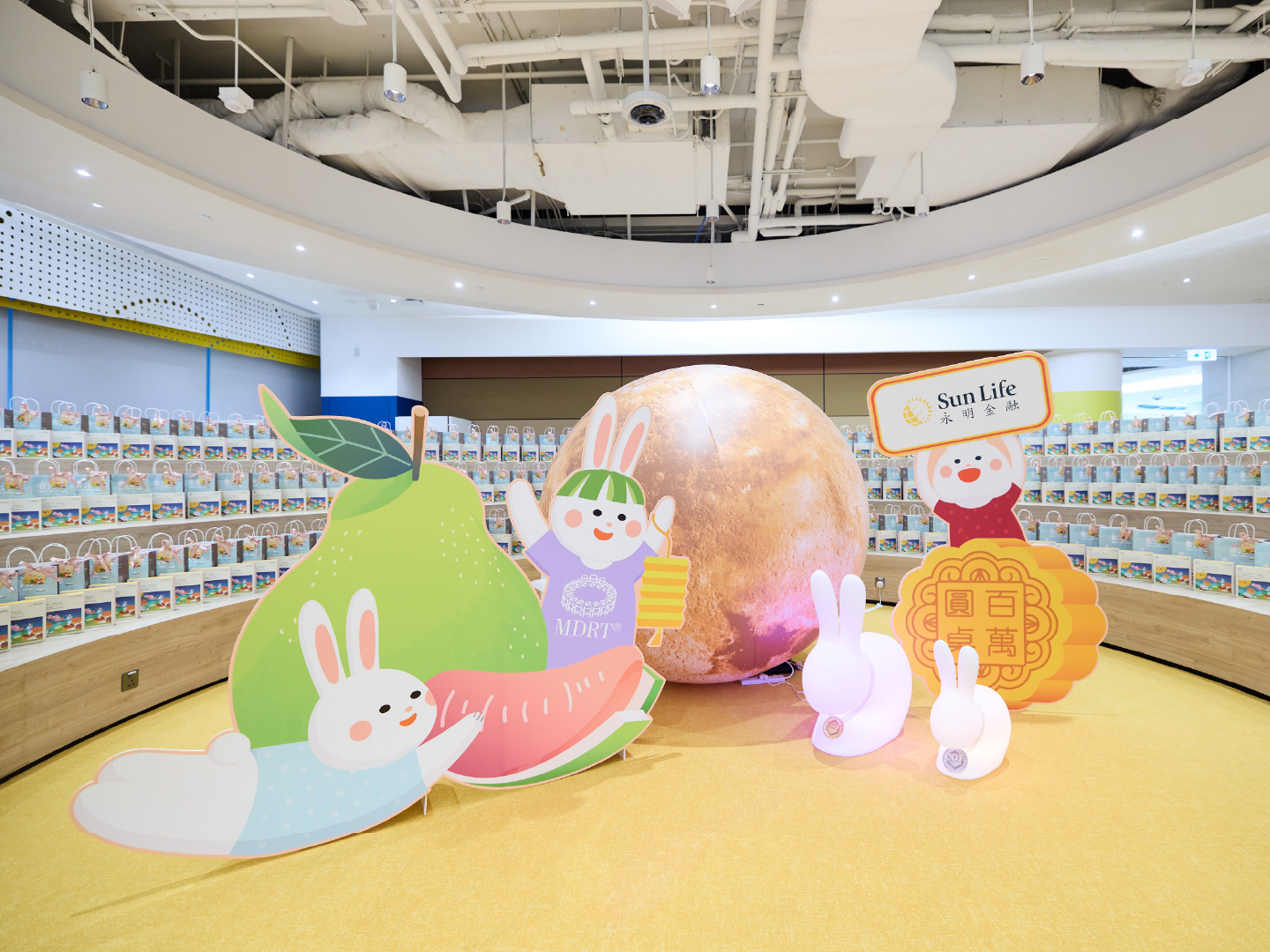 Our team designed a key visual featuring a full moon and playful rabbit characters, which was applied across video content, animations, graphic design, mooncake packaging, and event collateral. The mooncake packaging incorporated this visual with messaging that highlighted Sun Life’s commitment to supporting disadvantaged communities through their MDRT journey. Event collateral included a custom backdrop with hanging lanterns, a large moon prop, and character cutouts, creating an immersive environment.